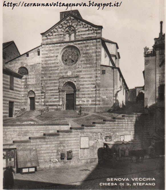 La chiesa di S. Stefano, ripristinata dopo i gravi danni arrecati dalle incursioni aeree del 1942 e del 1943, è una delle più antiche chiese di Genova; eretta verosimilmente nel sec. XII, almeno nella parte presbiteriale, fu riconsacrata nel 1217 da Ugolino Conti, cardinale di Ostia e poi papa Gregorio IX, in occasione del rifacimento della facciata.
